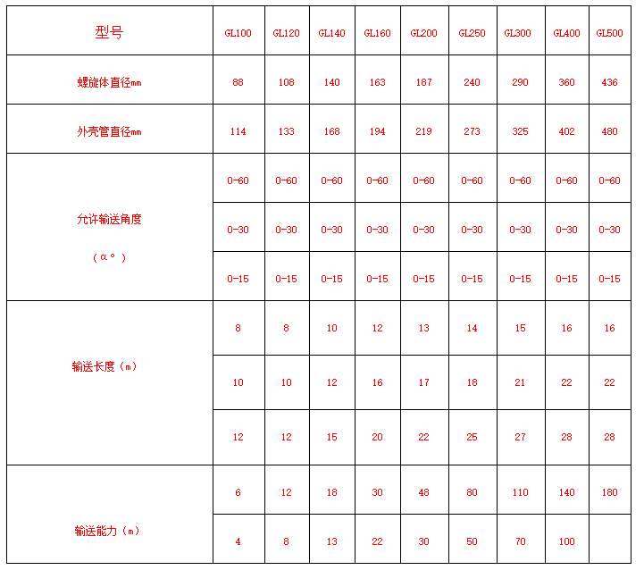 管式螺旋輸送機適用于水平或傾斜輸送粉狀、粒狀和小塊狀物料,如煤、灰、渣、水泥、糧食等,物料溫度小于200℃,不適宜輸送易變質的、黏性大的、易結塊的物料。參數如下: