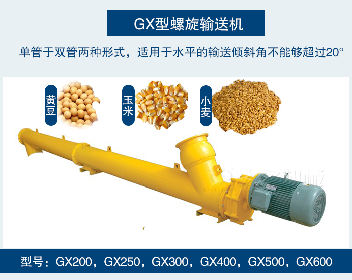 GX型螺旋輸送機是較老的螺旋輸送設備,其有單管于雙管兩種形式,適用于水平的輸送傾斜角不能夠超過20°??奢斔鸵恍K狀的(小塊狀物料)例如:麥子,玉米,黃豆等糧食。