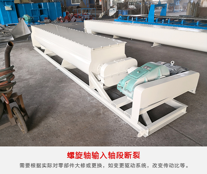 由于螺旋給料機(jī)安裝時(shí),螺旋軸同軸度超差或選軸時(shí)安全系數(shù)偏低等引起,根據(jù)生產(chǎn)需要進(jìn)行設(shè)備改造維護(hù),當(dāng)工藝變化,超出設(shè)備性能范圍時(shí),繼續(xù)運(yùn)行會(huì)造成設(shè)備快速損壞,甚至滿足不了生產(chǎn)工藝要求,影響正常生產(chǎn)。需要根據(jù)實(shí)際情況和現(xiàn)場(chǎng)條件,對(duì)零部件大修更換,如變更驅(qū)動(dòng)系統(tǒng),改變傳動(dòng)比,提高備件材料性能或尺寸變化,直至更換設(shè)備。
