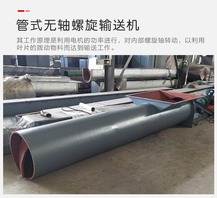 管式無軸螺旋輸送機其,工作原理與管式有軸螺旋輸送機的工作原理大致相同,其都是利用電機的功率進行工作的實現,然而它們之間的不同就是其,有/無螺旋軸的區別
