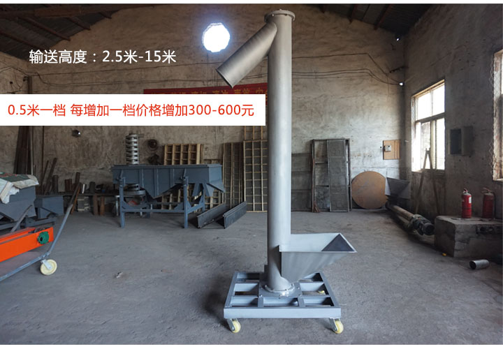 垂直螺旋輸送機的輸送高度在2.5米-15米;每0.5米為一檔,每增加一檔,價格增加300-600元,大家可根據需要選擇高度。