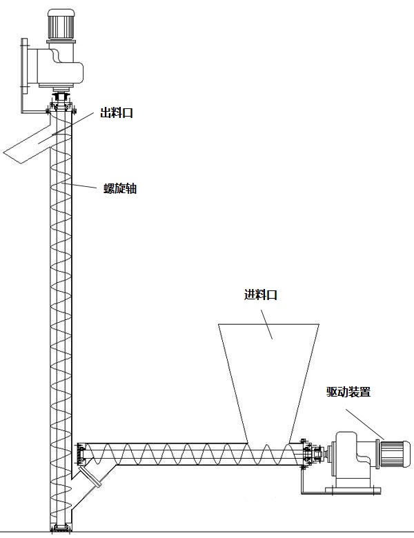 物料隨螺旋高速旋轉,被輸送的物料從水平部分的進料口加入,通過旋轉的水平進料螺旋送入輸送機和垂直部分,然后將物料向上推至出料口出料口由垂直螺旋,物料隨螺桿高速旋轉,被輸送的物料從水平部分的進料口加入,通過旋轉的水平進料螺旋進入輸送機。和垂直部分,然后用垂直螺旋將物料推到出料口排出。