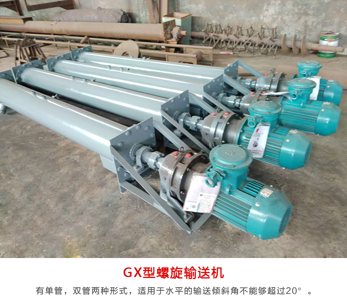 GX型螺旋輸送機(jī)有單管,雙管兩種形式,適用于水平的輸送傾斜角不能夠超過20°??奢斔鸵恍K狀的(小塊狀物料)例如:麥子,玉米,黃豆等糧食。