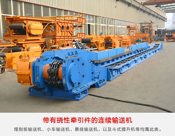 帶式輸送機、鏈板輸送機、刮板輸送機、埋刮板輸送機、小車輸送機、懸掛輸送機,以及斗式提升機等均屬此類。其工作特點是把物品置于承載件上,由撓性牽引件搬運承載件沿著固定的線路運動,靠物品和承載件的摩擦力使物品與牽引件在工作區(qū)段上一起移動。