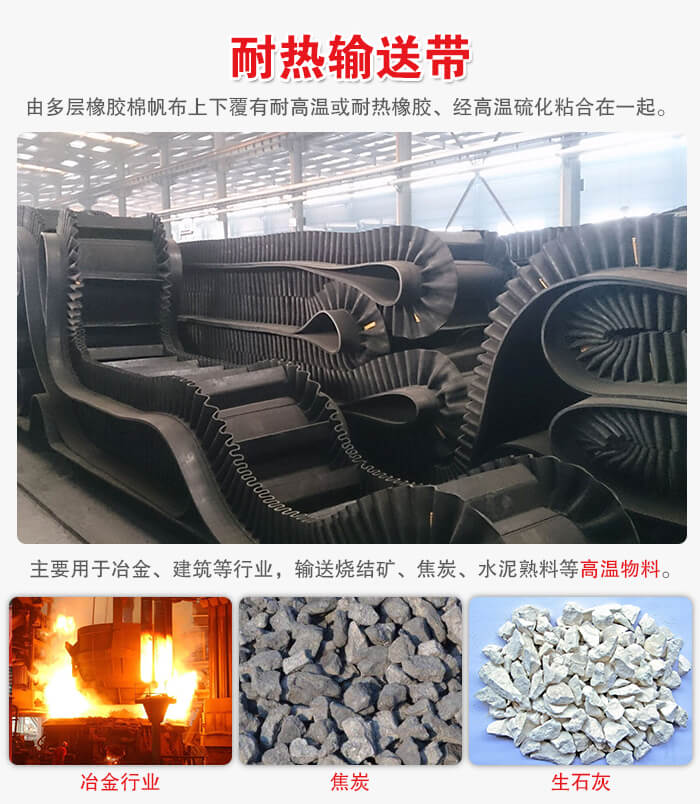 耐熱輸送帶是由多層橡膠棉帆布(滌棉布)或者聚酯帆布上下覆有耐高溫或耐熱橡膠、經高溫硫化粘合在一起的,可以輸送175℃以下熱焦碳、水泥、熔渣等物料,主要用于冶金、建筑等行業,輸送燒結礦、焦炭、水泥熟料等高溫物料。